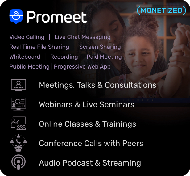 PromeetSaaS is the SaaS version of our popular & most advanced product "Promeet". It allows you to monetize using the Subscription feature with Online Payment and "Plans" with Feature Control & Limitations for your tenants.